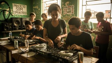 A mão direita ajusta o pitch fader com precisão milimétrica, enquanto a esquerda manipula o crossfader em uma coreografia de…